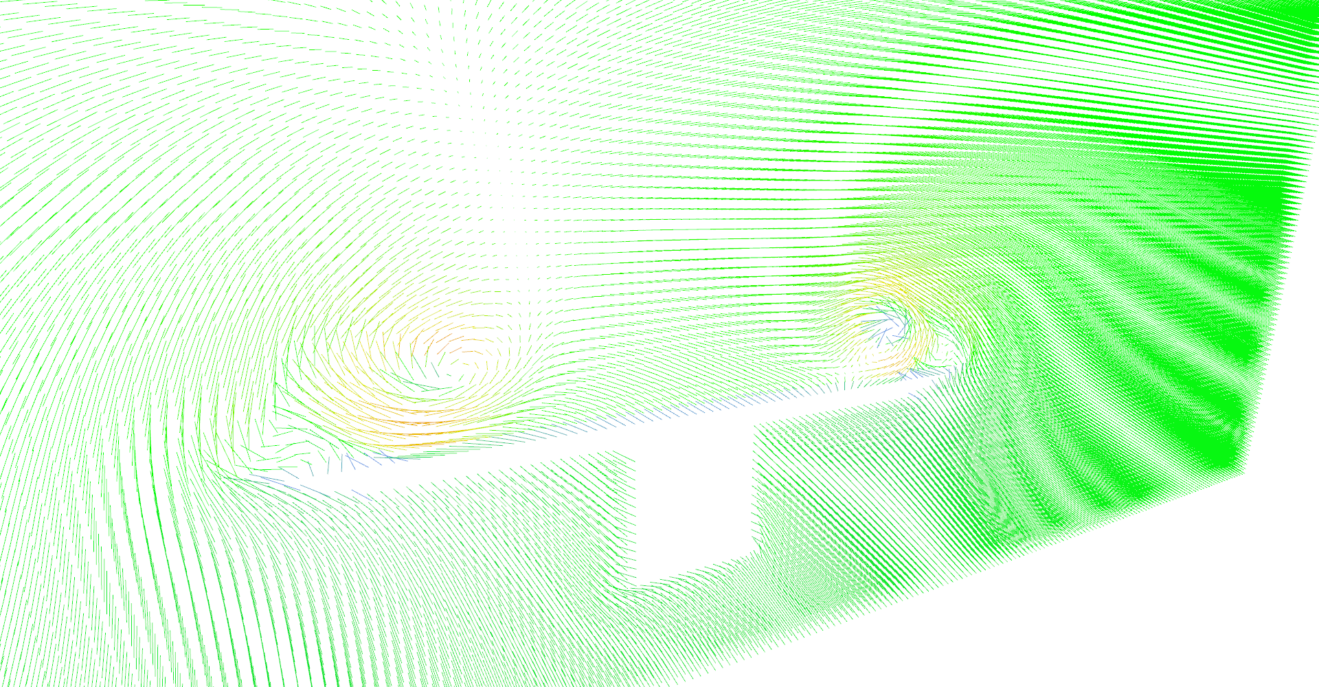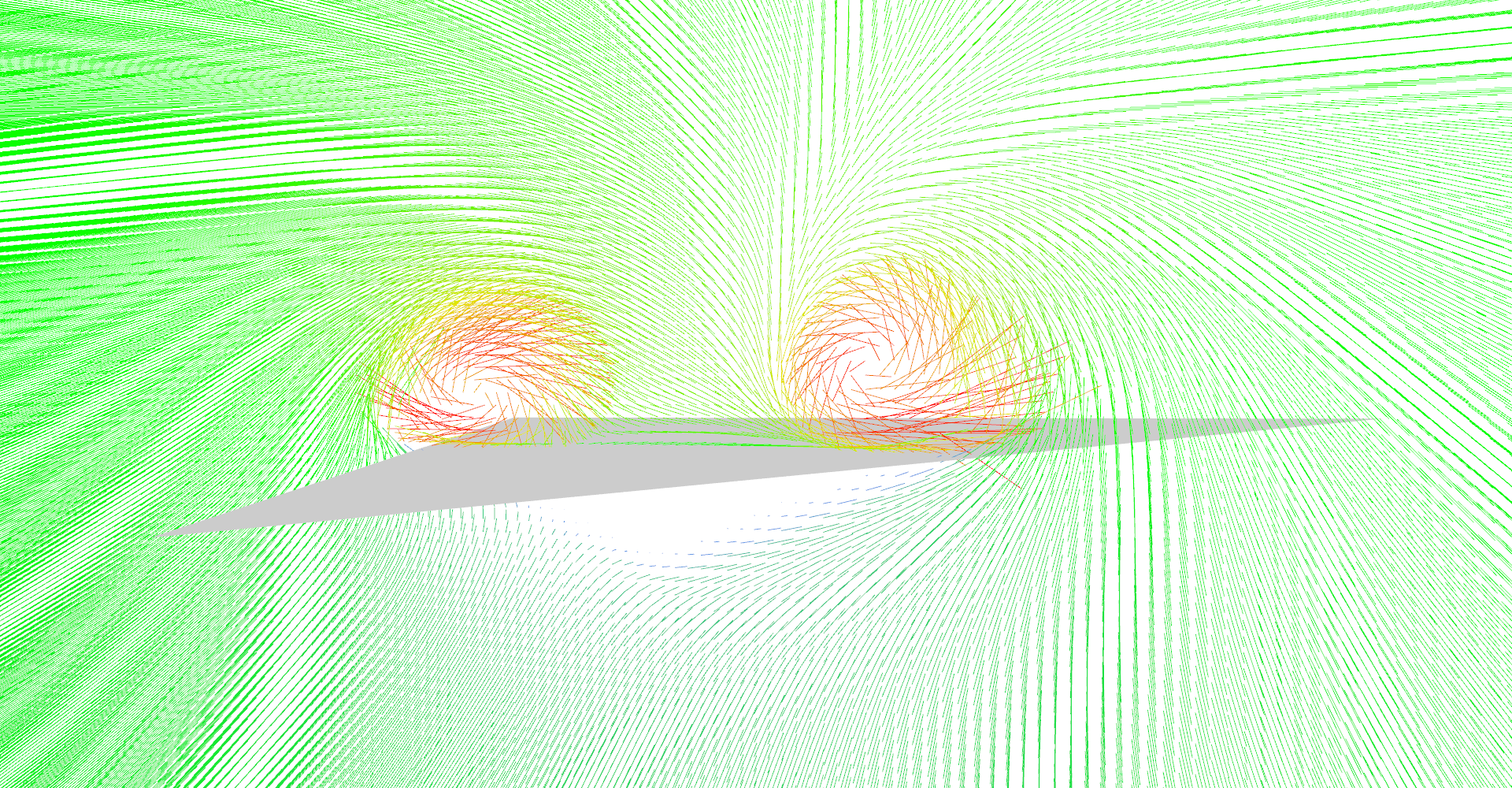 High density line glyphs plane effectively visualizing magnitude field. Plane is just behind the front of the wing.