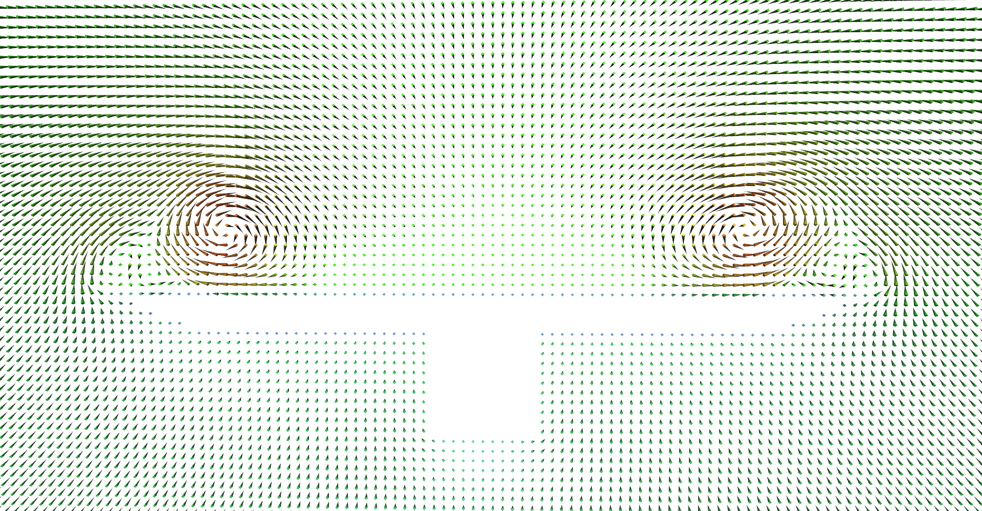 Vector field magnitudes near the end of the wing. Wing itself is not shows which reveals box under the wing. Notice that wind is slower near the surface of the wing.