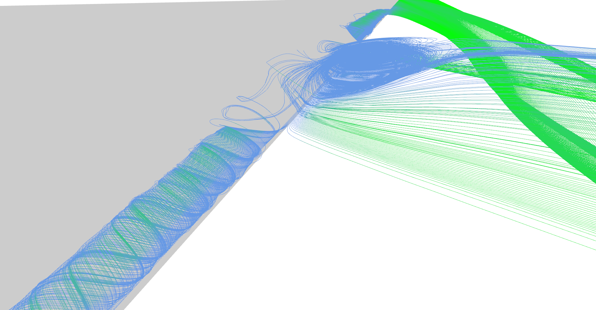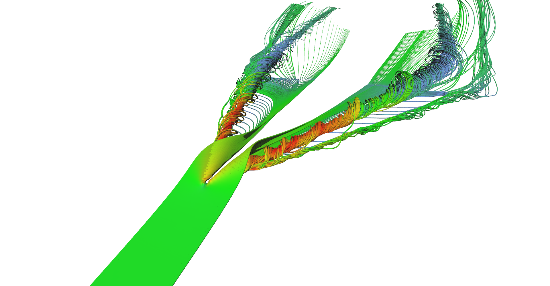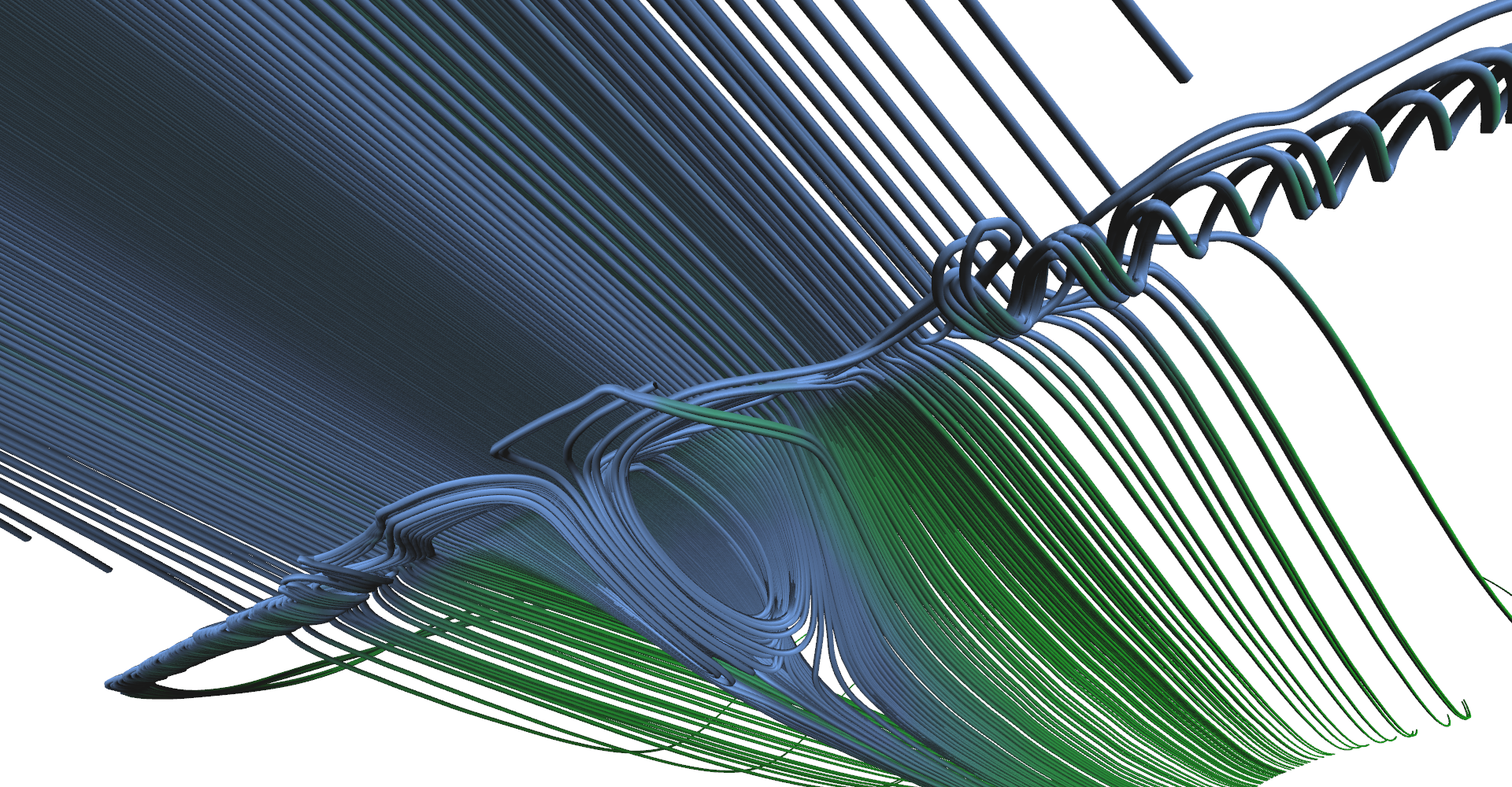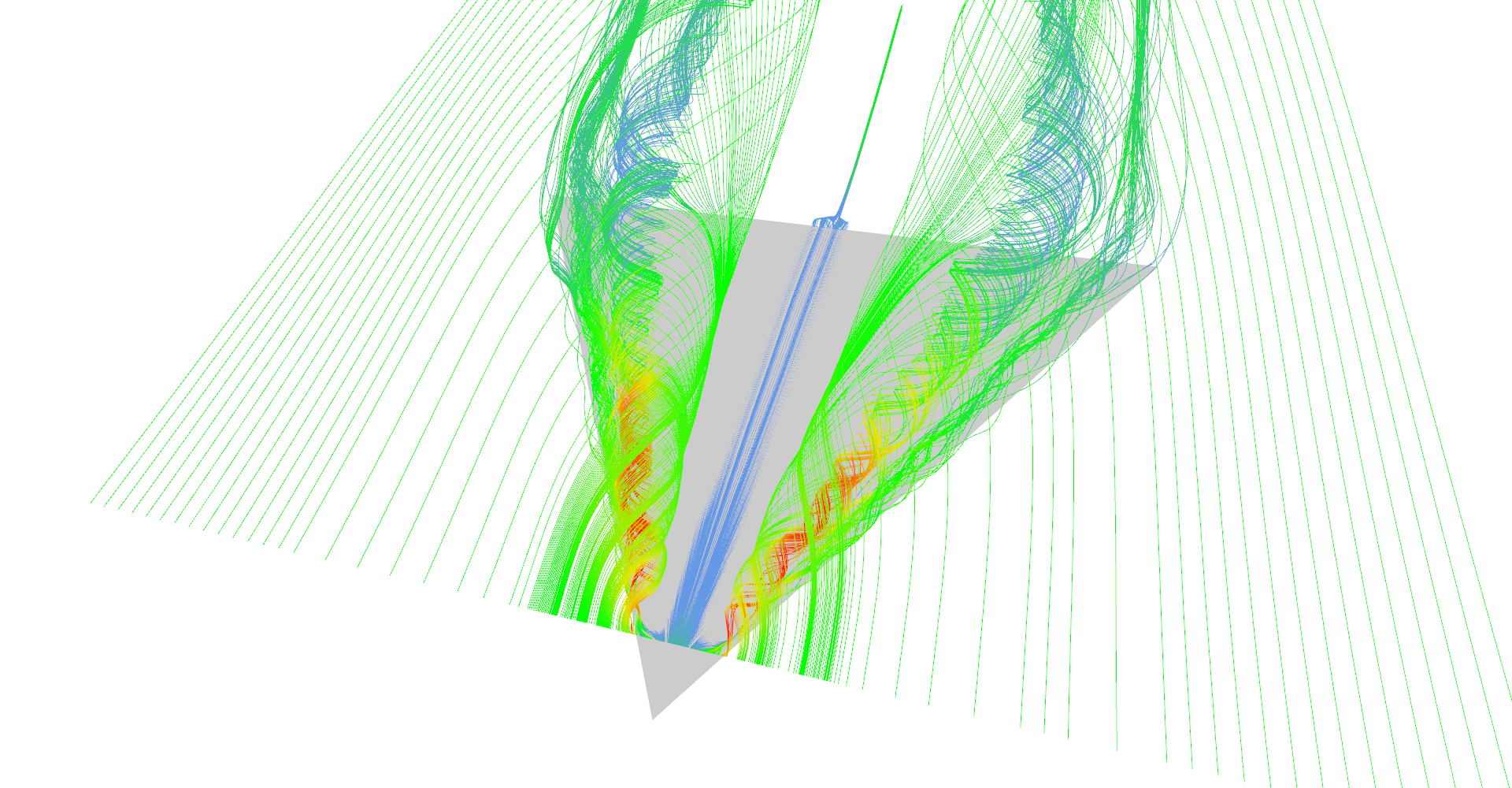 Stream tubes showing the main features of the delta-wing dataset - primary and secondary vortices and air going sideways behind the back edge of the wing.