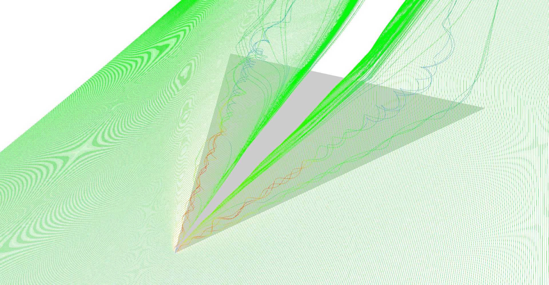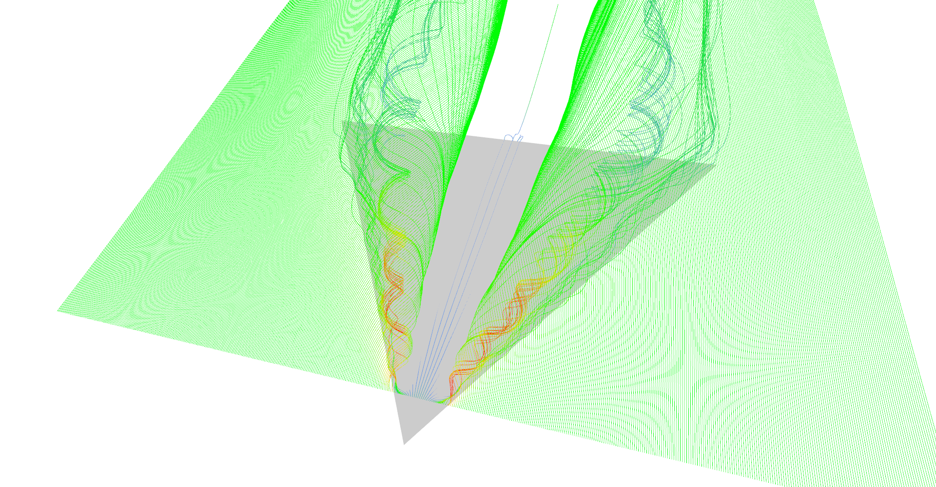 This section shows results of stream line visualization of delta-wing vector field data set. This type of visualization will provide much better understanding of the data than glyphs described in Chapter 2: Visualization using glyphs.
