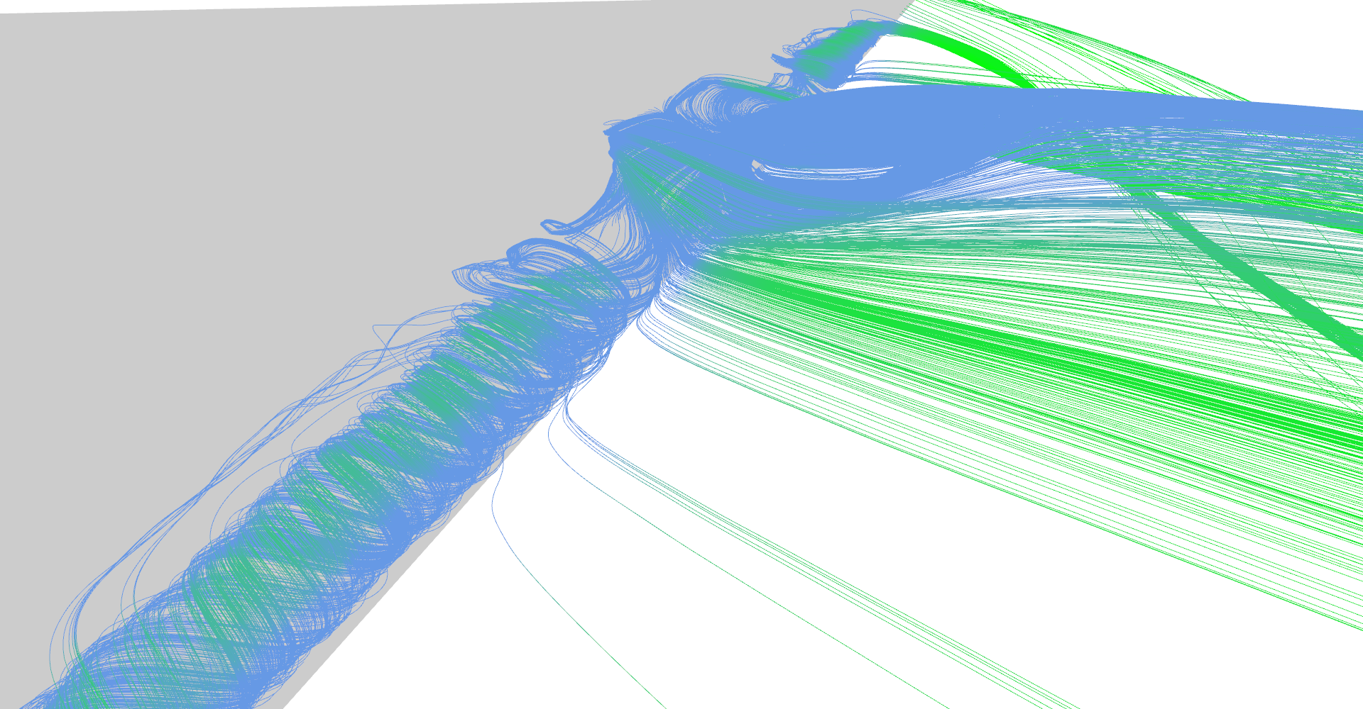 As mentioned in Chapter 3: Vector field integrators for stream line visualization, stream line is trajectory of mass-less particle in vector field. Once we have an integrator, visualization is straight forward. Seed the stream line somewhere in the vector field, compute points at discrete time steps and connect them to a line. Color of the line segment represents the vector magnitude - in our case speed of the air.