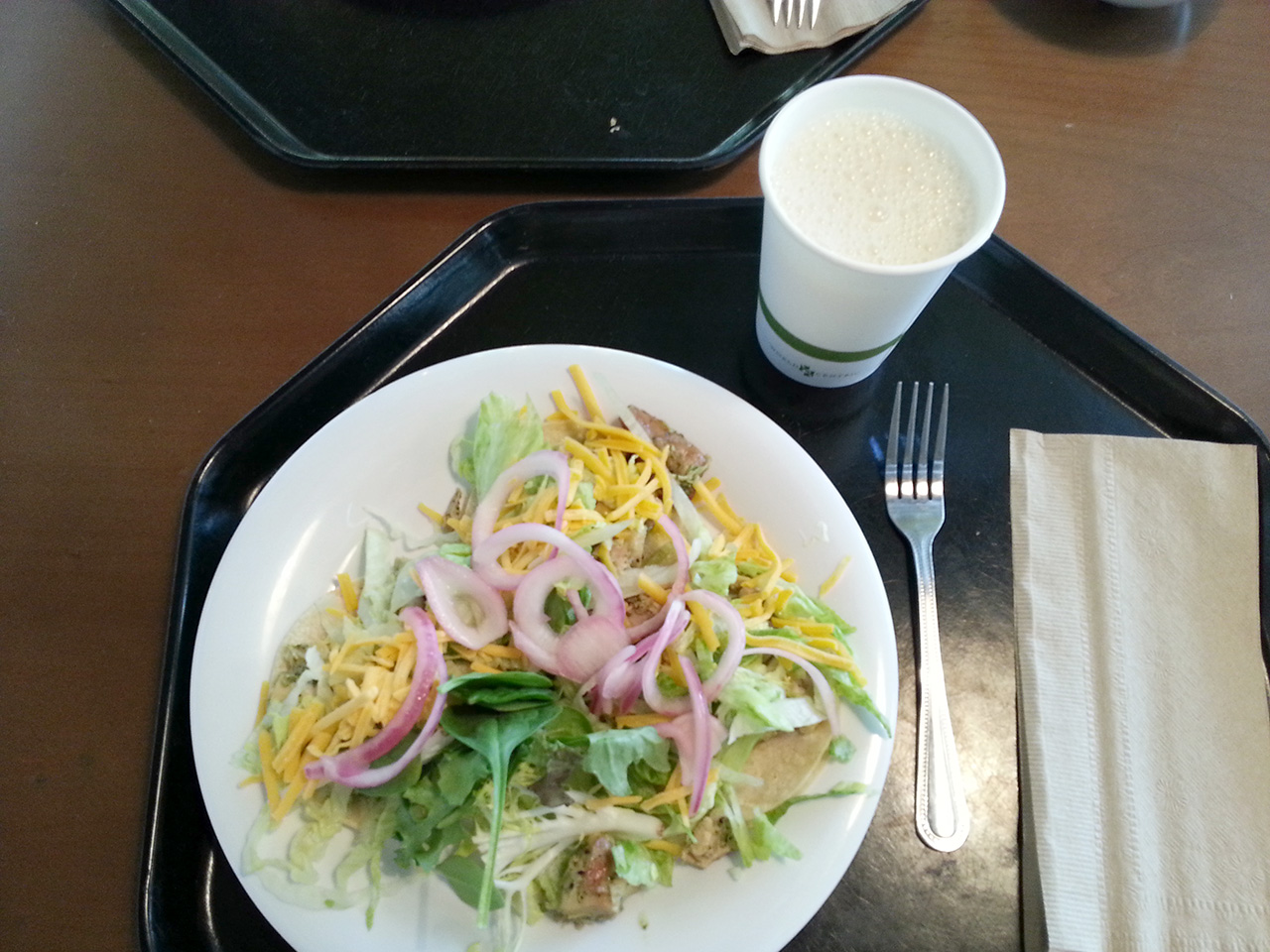 My first food in the Google — chicken tacos (they are under the lettuce :).
