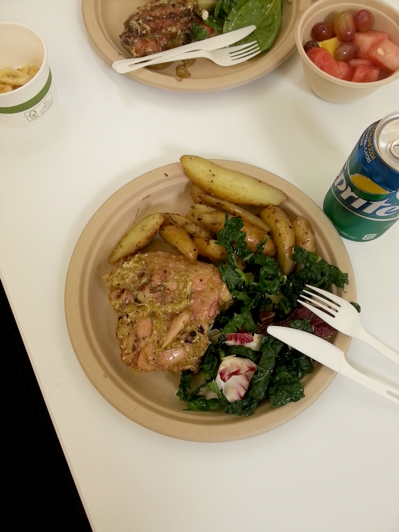 Chicken mix with delicious potatoes! The plate and the cutlery are compostable!