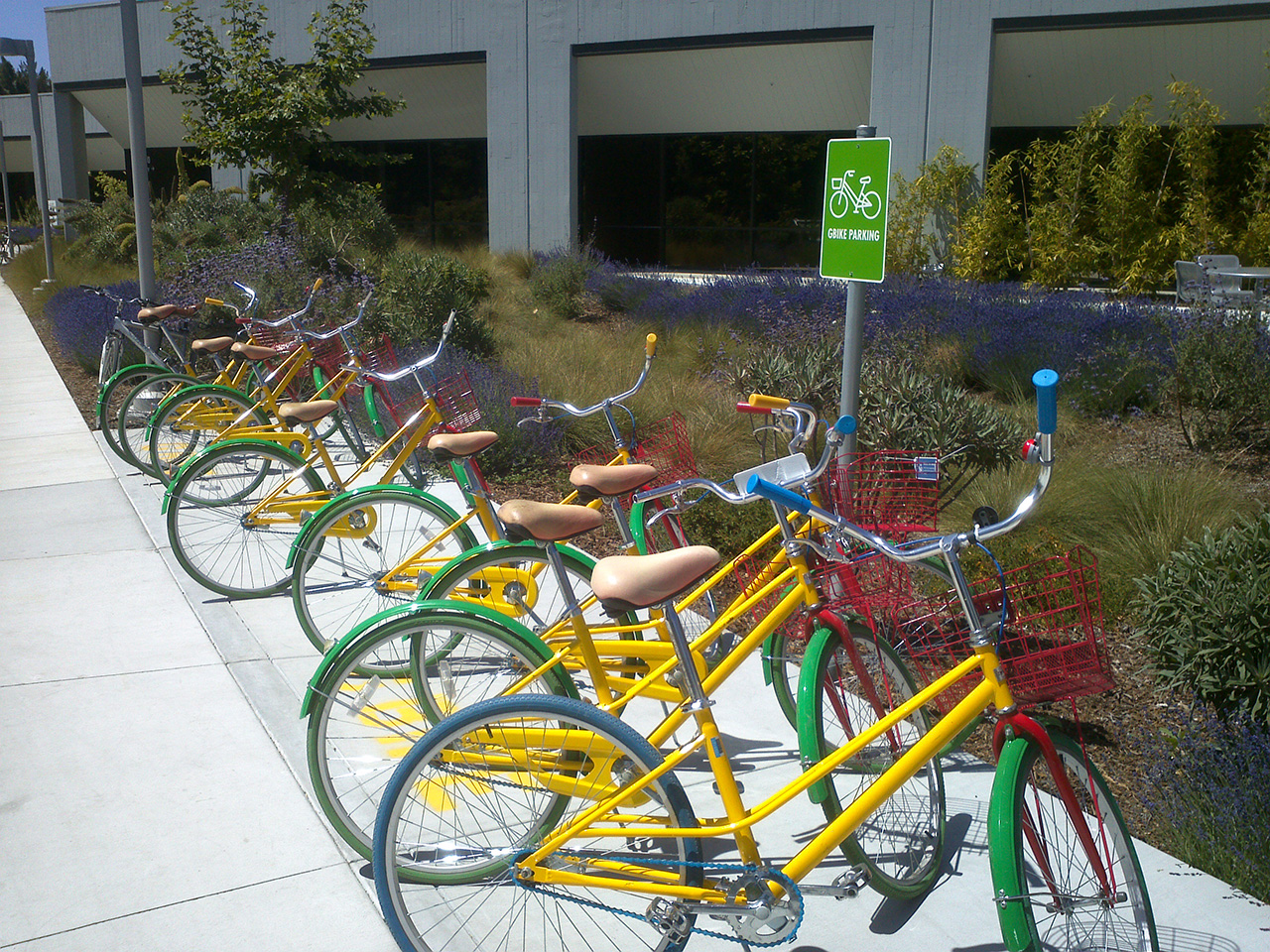 Another convenient perk in Google are so called G-bikes — fancy looking community bikes that are available for Google employees in front of every building. G-bikes provide fast and convenient way how to move around campus. Google campus in Mountain View is quite large, about a mile (1.6 km) across and G-bikes are very convenient mean of transportation across this distance.