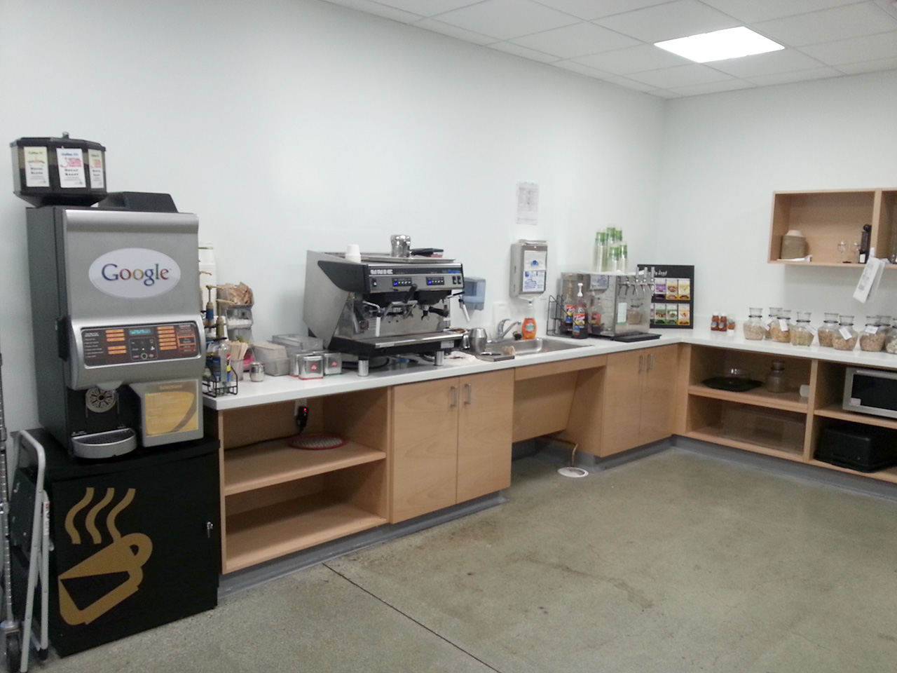 Every floor has one or more so called "micro-kitchens" where you can find things like snacks, cereals, milk, non-alcoholic beverages, tea, coffee, and many more. Micro-kitchens usually have two coffee machines. One is automatic which will grind and prepare your coffee in a minute. The second one is a professional machine used in cafeterias by baristas. Before you will be able to use the professional machine you will probably have to watch a video tutorial that is internally available.