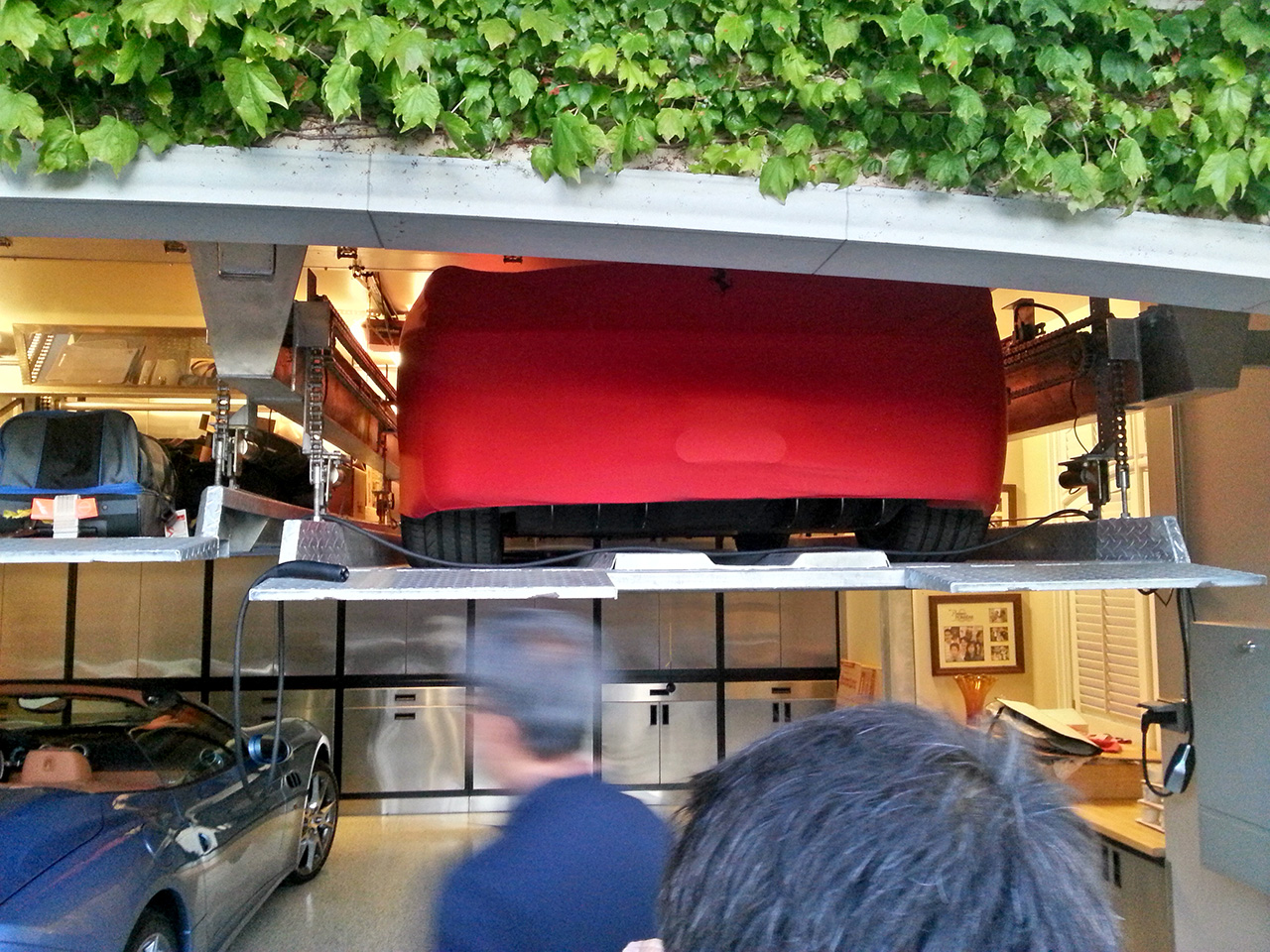 Yeah, his garage has second floor. He made joke that he needs to store his cars somewhere and one floor was not enough. Then he lowered the second floor. There it was. Bright red Ferrari covered by red silk sheet. He uncovered if and jumped in and started it up! Just awesome! Then he offered one female intern to go inside and try it so she did. She seemed quite nervous (and who wouldn't be :).