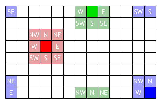 Figure 3: Red, green, and blue cells with their Moore neighborhood in a cyclic world.
