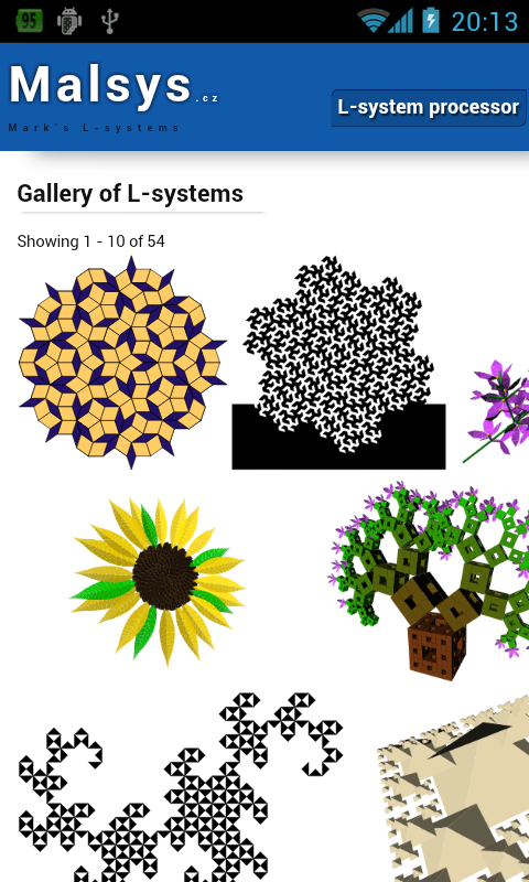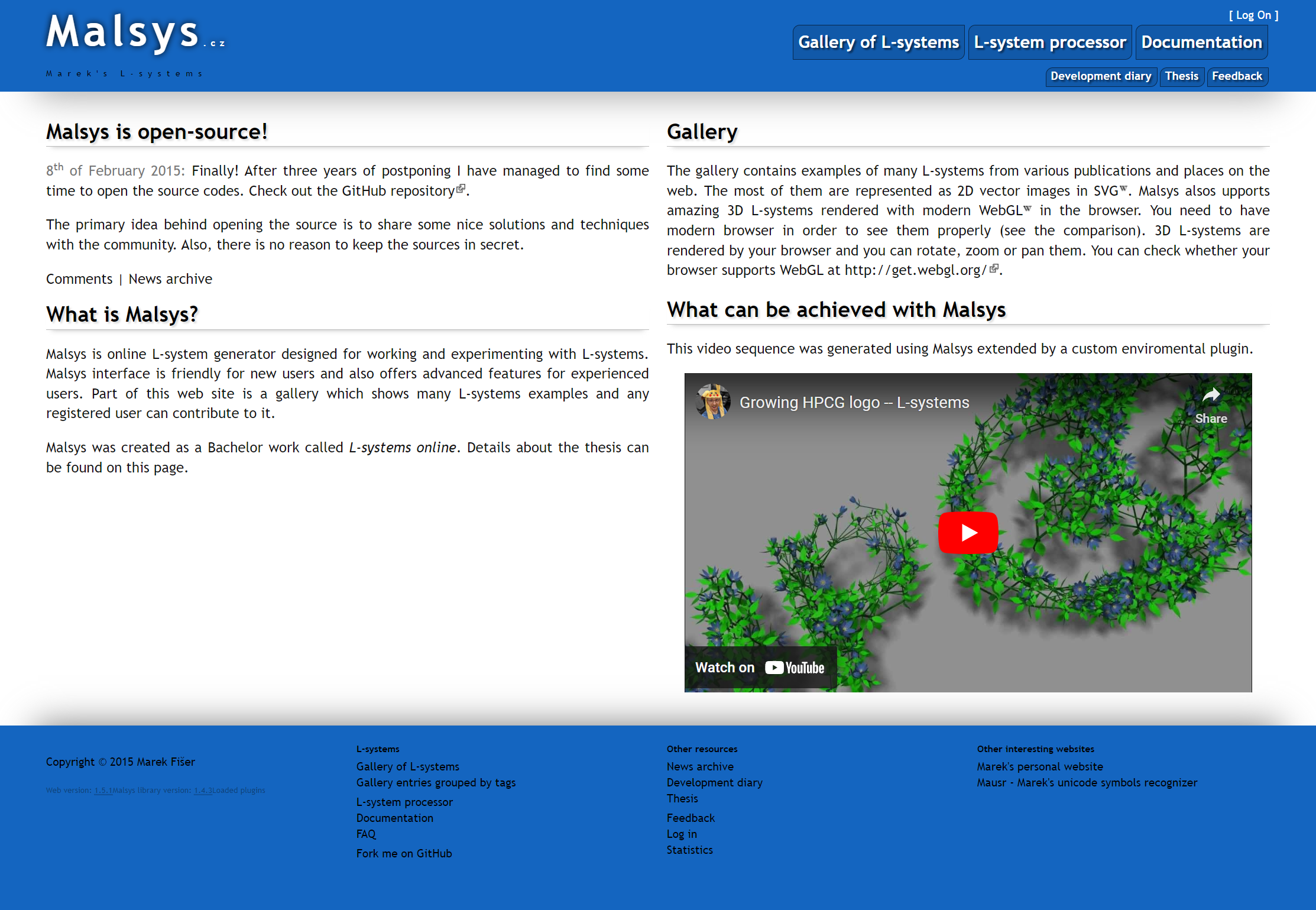 Malsys is an L-system processing library with web interface and interactive gallery. Malsys supports advanced L-system features like context rewriting or parametric L-systems as well as some unique features like rewriting symbol as another L-system. This project was done as my bachelors thesis at Charles university in Prague