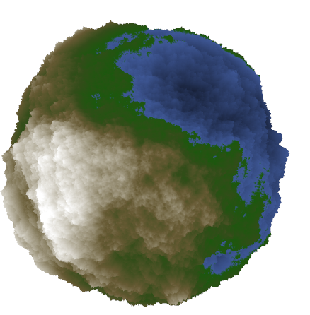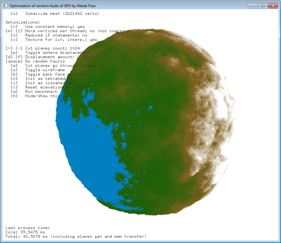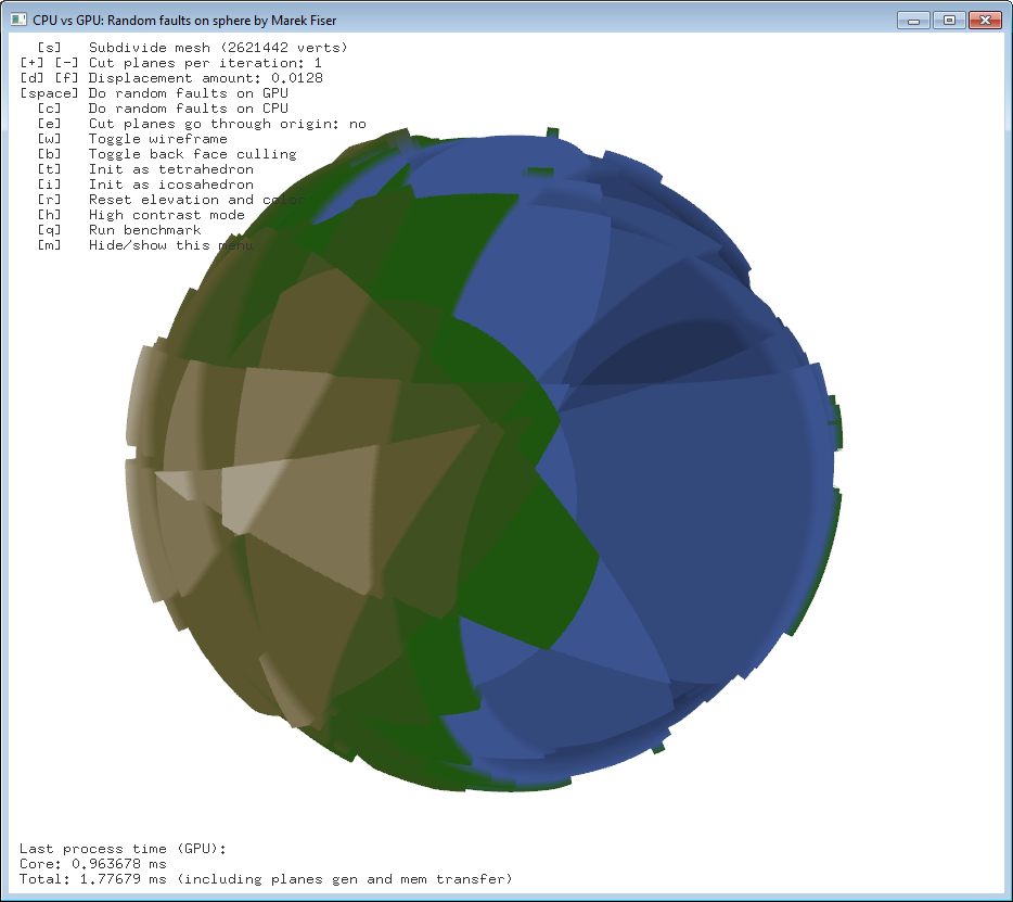 Random faults algorithm can be applied on nearly any primitive. Usually it is a plane but I decided to apply in on a sphere hoping that I will model some kind of Earth-looking planet. The only problem with Earth it that its diameter is much larger than elevation of mountains (you can't see any mountains from the space). However, the main goal was to measure performance of this algorithm so I am leaving visual evaluation up to you.
