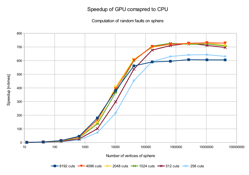 Comparison of performance of CPU and GPU implementations of random faults algorithm for random terrain generation. Speedup of GPU over CPU is over 700x. Project uses shared VBO's to avoid CPU-GPU data transfer which makes it an interactive experience.