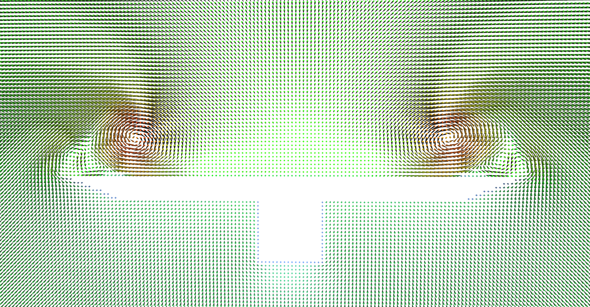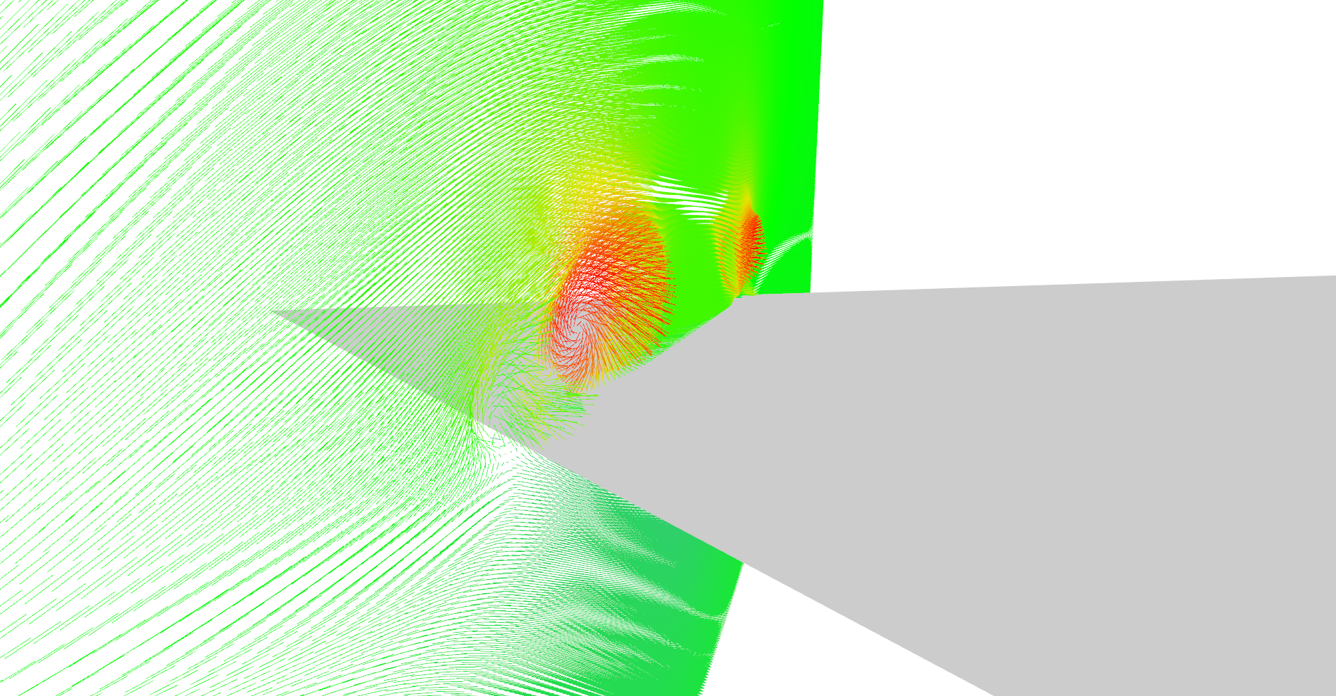 High density line glyphs plane effectively visualizing magnitude field. Plane is just behind the front of the wing.