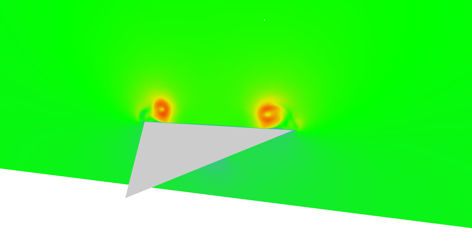 Vector field magnitudes near the end of the wing. Wing itself is not shows which reveals box under the wing. Notice that wind is slower near the surface of the wing.