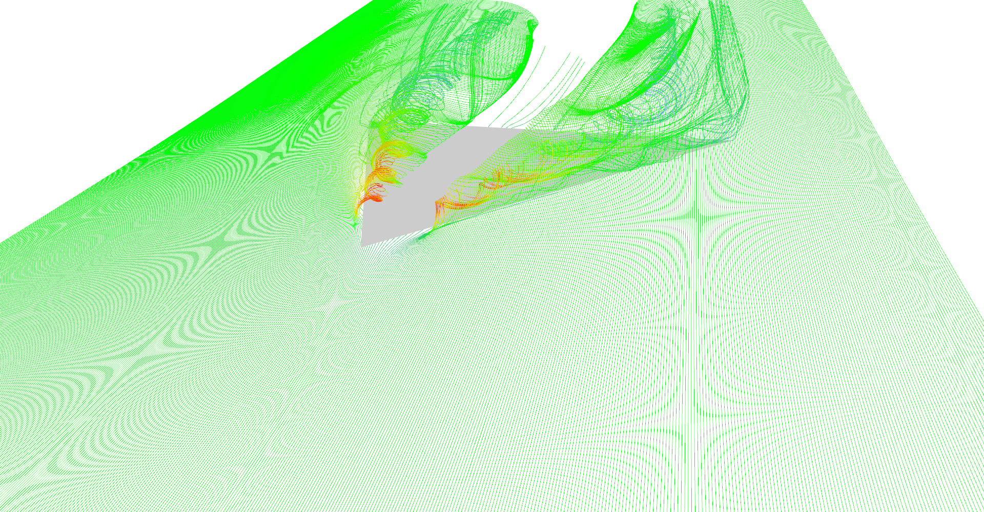 Stream tubes showing the main features of the delta-wing dataset - primary and secondary vortices and air going sideways behind the back edge of the wing.