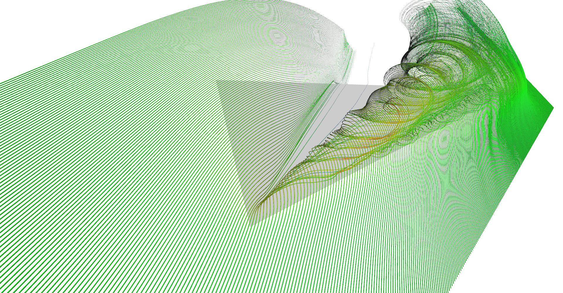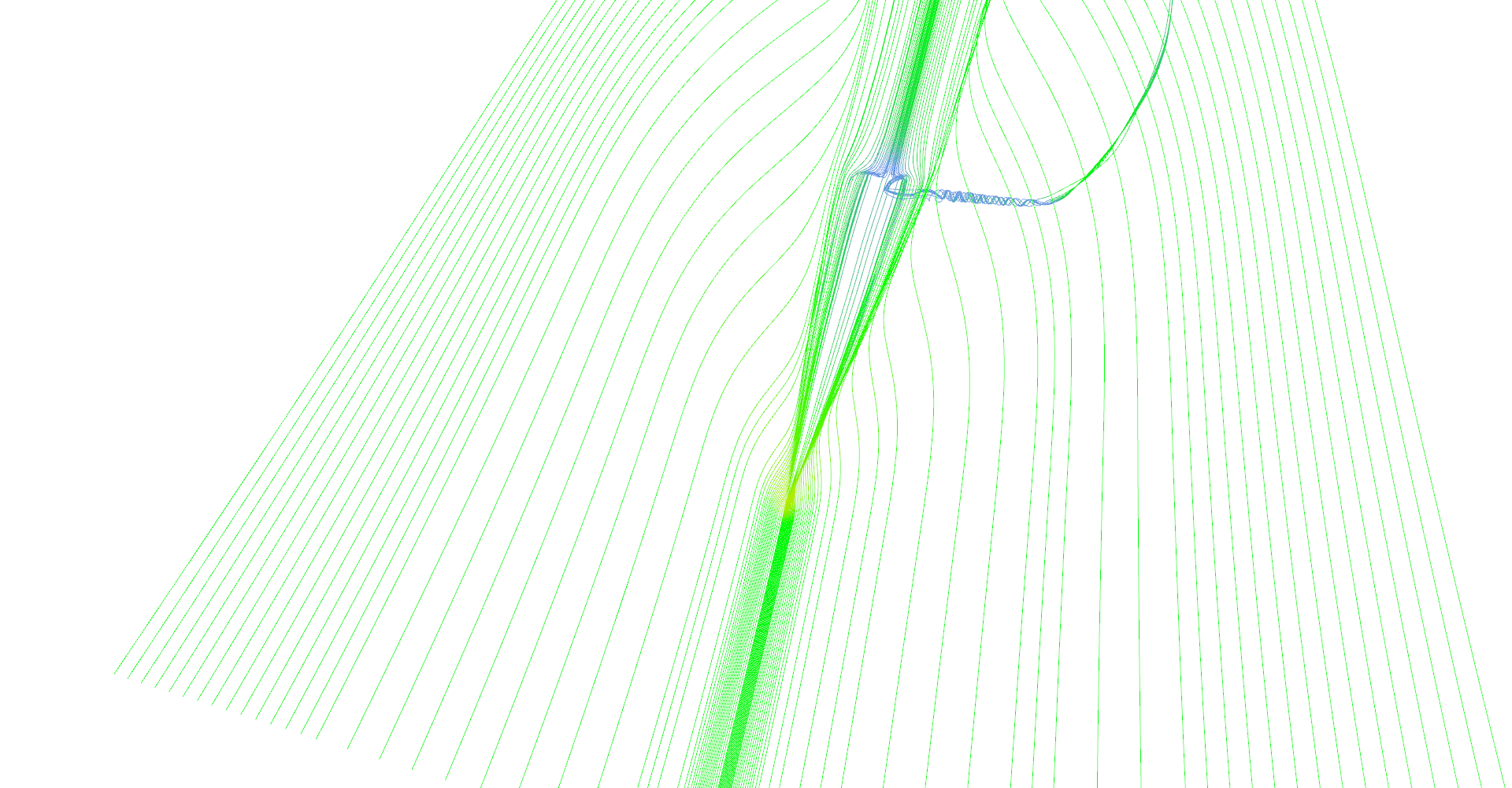 As mentioned in Chapter 3: Vector field integrators for stream line visualization, stream line is trajectory of mass-less particle in vector field. Once we have an integrator, visualization is straight forward. Seed the stream line somewhere in the vector field, compute points at discrete time steps and connect them to a line. Color of the line segment represents the vector magnitude - in our case speed of the air.