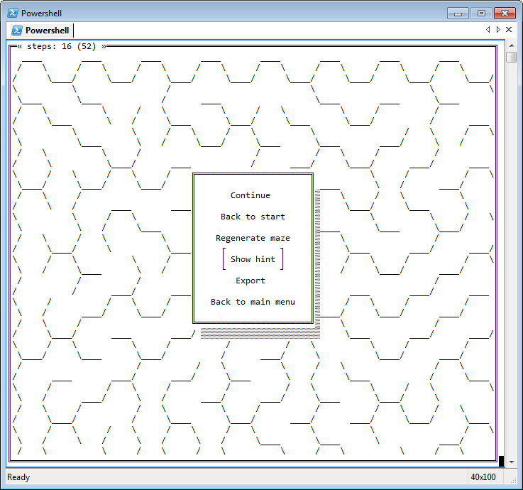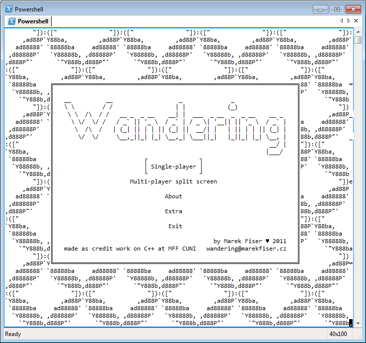Wandering is a generic maze generator, solver, and game playable in a console. It supports hexagonal and rectangular mazes and two types of maze generators. Cool thing is that the maze type is independent of the solver. Every solver can solve every type of maze. It is possible to define new maze types, generators, and solvers. Another cool feature is the UI system in a console including menus, text boxes, windows, and screen manager. This was my first larger program written in C++.